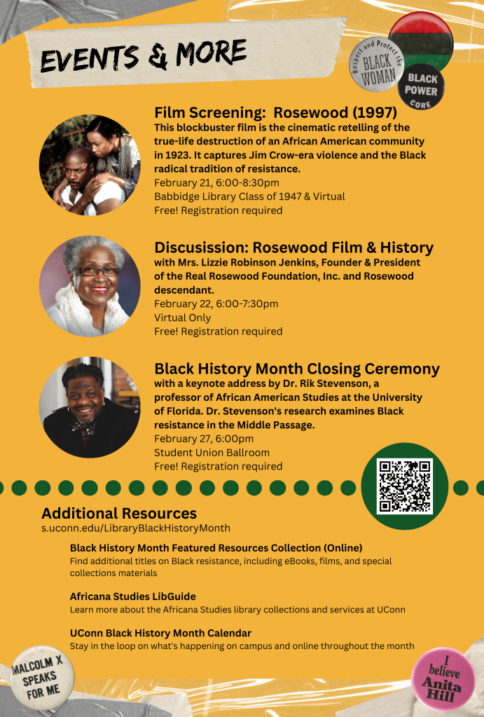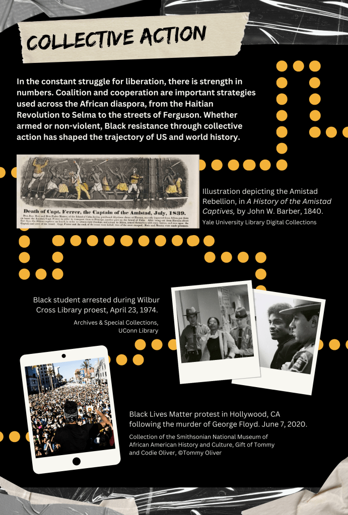 In honor of the 2023 Black History Month theme of Black Resistance, the UConn Library will present Disorder in the Night: Narratives of Black Resistance, 1723-2023, a display curated by Stephanie Birch. The display will be exhibited in the Homer Babbidge Library and each regional campus library. Disorder of the Night is a celebration and contemplation of the Black radical tradition, inviting audiences to reflect on and reconsider what it means to resist.
